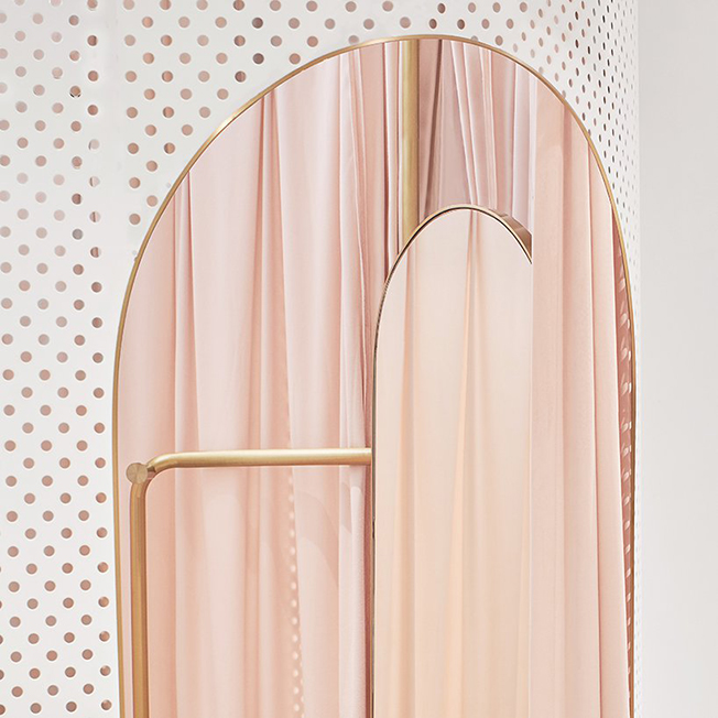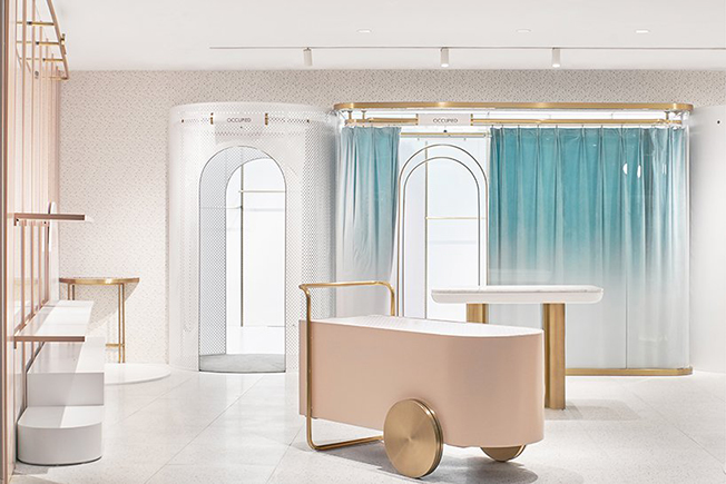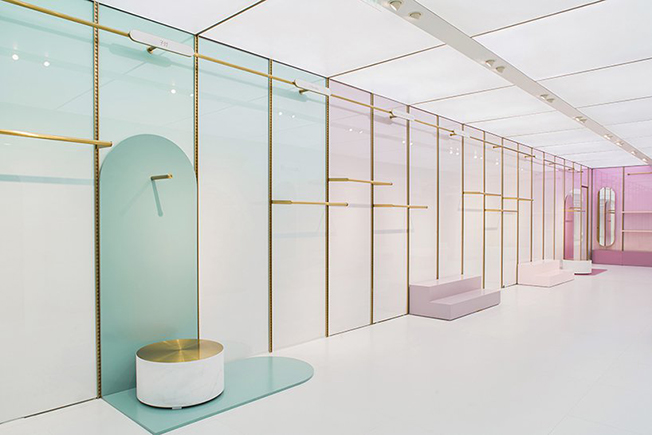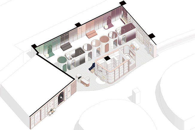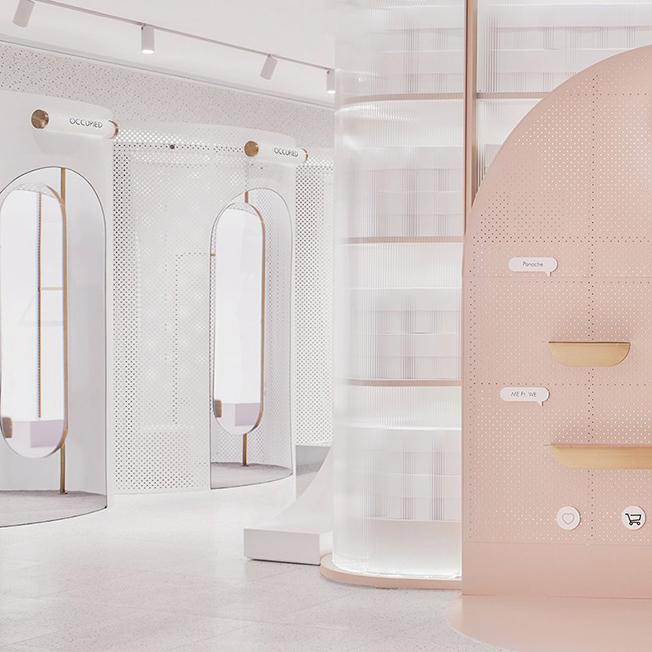Магазин состоит из семи примерочных на площади 200 кв. метров. Идея в том, чтобы предоставить друзьям место, где можно переодеться, сфотогрфироваться и насладиться покупками. Раздевалки располагаются в виде ряда, разделяющего все пространство концепт-стора. Клиенты могут переходить через любую из неиспользуемых примерочных, пересекая магазин с одной стороны на другую.