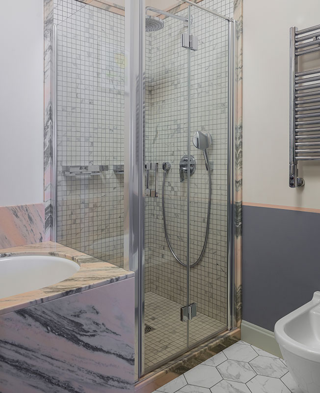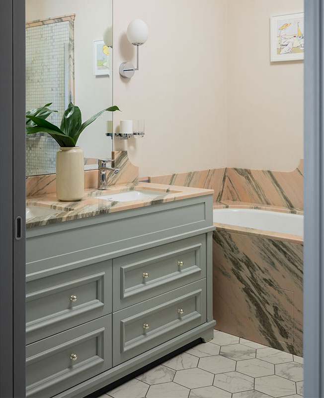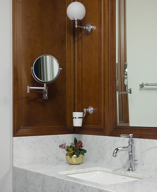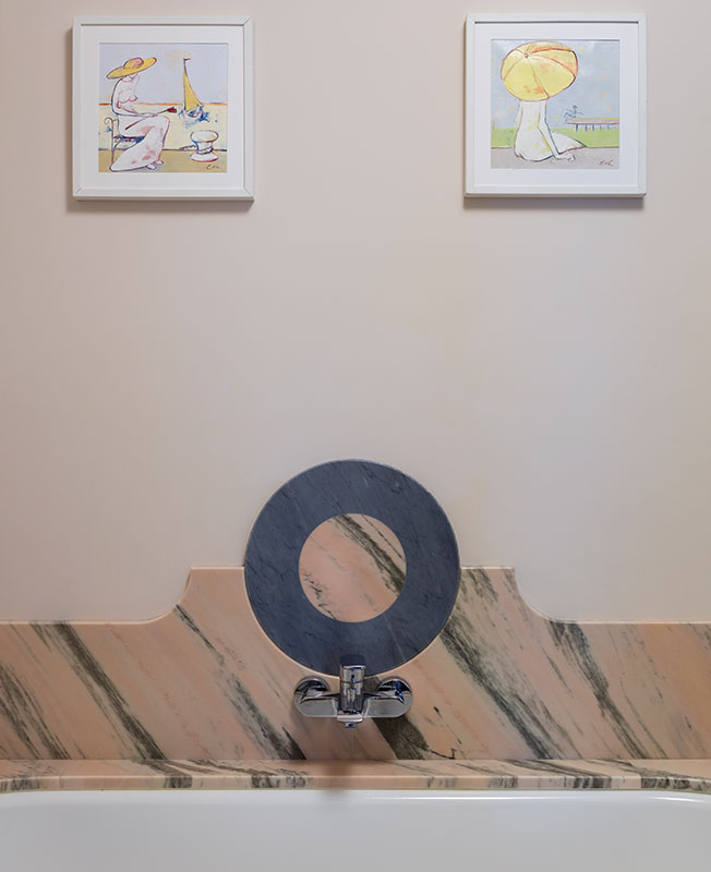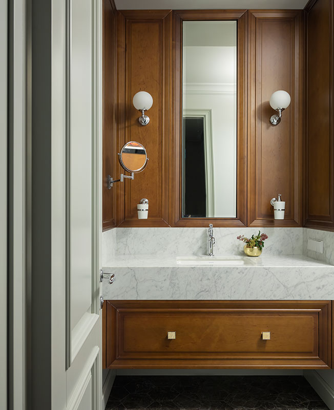 Стены окрашены в однотонные спокойные оттенки и декорированы молдингами. «Мы любим крашеные стены даже в санузлах: таким образом удается сделать акцент на том, что это в первую очередь комната, а потом только ванная».