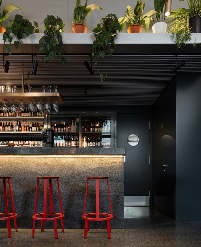 Фрагментарно был восстановлен и оштукатурен кирпич, специально для проекта сделан темный терраццо с внедрением битого стекла — на полах и барной стойке.