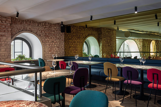 Более комфортная посадка с двумя винотеками разместилась на верхнем уровне. Атмосферу приватности подкрепляет бортик ограждения с озеленением. Подвальный этаж, который раньше был частью древних соляных складов, заняла кухня.