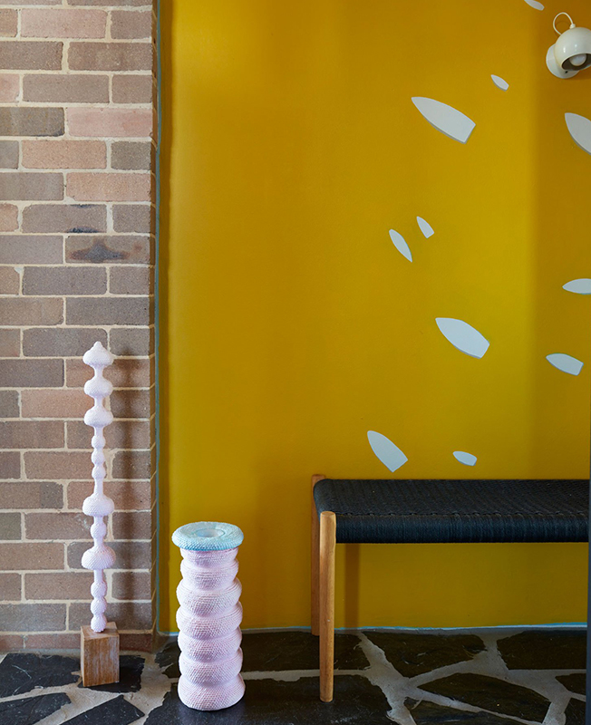 Ясмин Гонием и Кэти Свальбе, студия Amber Road, переделали дом 1960-х годов постройки в австралийском пригороде Сиднея. Расположенный в приморском районе ранее неприметный двухэтажный дом с двумя спальнями и двумя ванными комнатами был превращен в современную виллу с тремя спальнями, тремя ванными комнатами и большими внутренними и наружными салонами для отдыха. Кухня была перенесена на первый этаж, а вся жилая зона внизу была расширена за счет террасы и красивого ухоженного сада. Тротуарный пол соединяет области интерьера и эстерьера. Вместо типичной стены с телевизором здесь установлен старинный камин, окруженный одной из красочных фресок. Название «Полихромный дом» эта, некогда традиционная кирпичная постройка, получила благодаря новой жизнерадостной палитре. Дом площадью 200 кв. метров нарушает многие правила, представляя собой редкий опыт сотрудничества архитекторов интерьера, не только с клиентом, но и с художником. Amber Road выбрали LYMESMITH, который создал две настенные фрески, а их палитра стала точкой отсчета для всего проекта. Произведения искусства и мебель создают между собой захватывающие колористичексие комбинации.