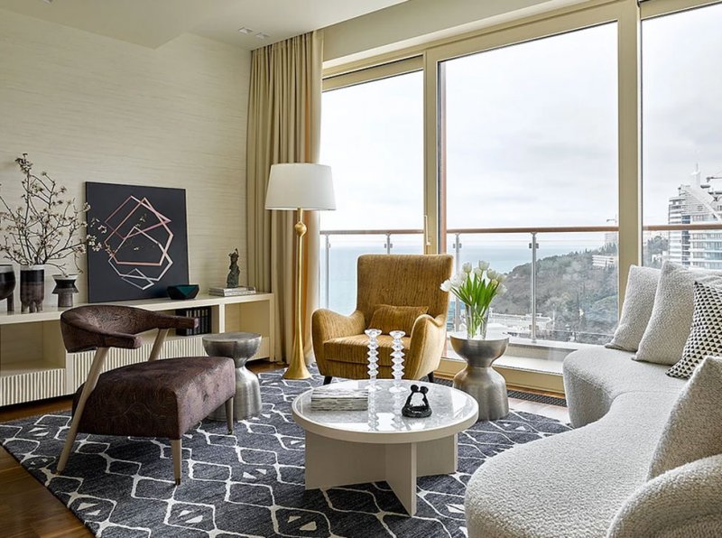Наталья Попова и Дарья Синотто создали в геометрически сложном пространстве утонченный интерьер с природными формами и палитрой, повторяющими живописный вид из окна на море. Квартира в Ялте 75 кв. метров предназначена для временного проживания — владельцы приезжают сюда для отдыха. Дизайнеры в первую очередь сосредоточились на эстетичной картинке, а после — на функциональности. Гостиная. Диван, Hamilton Conte. Картина Songe Bleu, Сара Пикон, Galerie du Crescendo. Главным достоинством квартиры стало панорамное остекление и впечатляющий вид на море. Масштабный балкон тянется вдоль всех жилых комнат, при этом из каждой есть выход на свежий воздух. Визуально легкое ограждение из стекла не мешает наслаждаться пейзажем. Гостиная. Кресло, Munna. Ковер, Feizy. Торшер, Visual Comfort