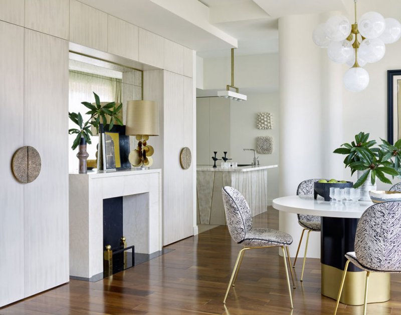 Столовая. Обеденный стол выполнен по эскизам дизайнеров. Стулья, Gubi в обивке Fabricut. Потолочный светильник, Visual Comfort & Co. Графика, антикварный салон во Франции.