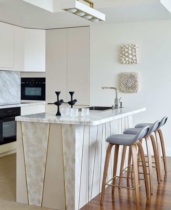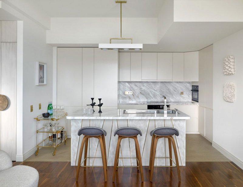 Кухня. Гарнитур и остров выполнены по эскизам дизайнеров. Барные стулья, Gubi. Потолочный светильник, Bert Frank.