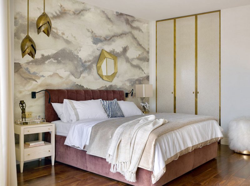 Спальня. Зеркало и подвесной светильник, Arteriors. Обои на стене и на фасадах шкафа, Phillip Jeffries. Винтажная настольная лампа, Италия. Тумбочки выполнены по эскизам дизайнеров.