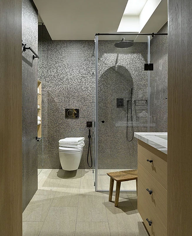 Ванная комната. Стены оформлены серой мозаикой с глянцевой поверхностью.