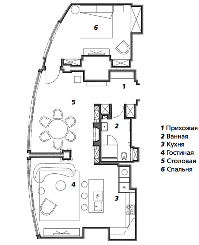 Нестандартное пространство потребовало аналогичных предметов обстановки — практически всю корпусную мебель делали на заказ. Дизайнеры решили привнести в интерьер не только природные оттенки, но и органические формы. Колонна с обтекаемым силуэтом напоминает гальку (те же линии повторяются в ножке обеденного стола), а округлая спинка дивана перекликается с изгибом внешней стены квартиры.