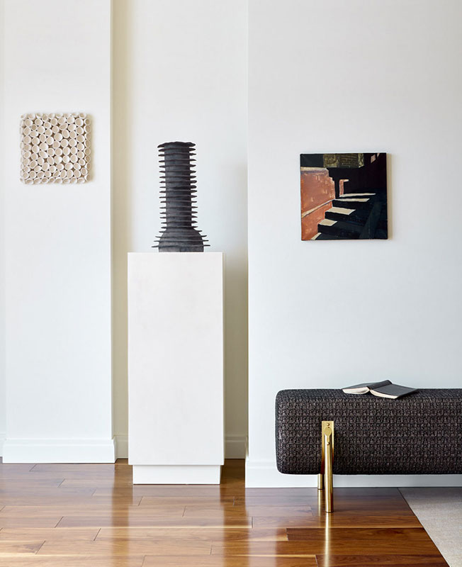Фрагмент прихожей. Банкетка выполнена по эскизам дизайнеров. Обивка, текстиль Fabricut. Керамическое панно, Dress Your Space. Ваза, Александр Хомутов. Картина, Мария Костарева, галерея Art Brut.