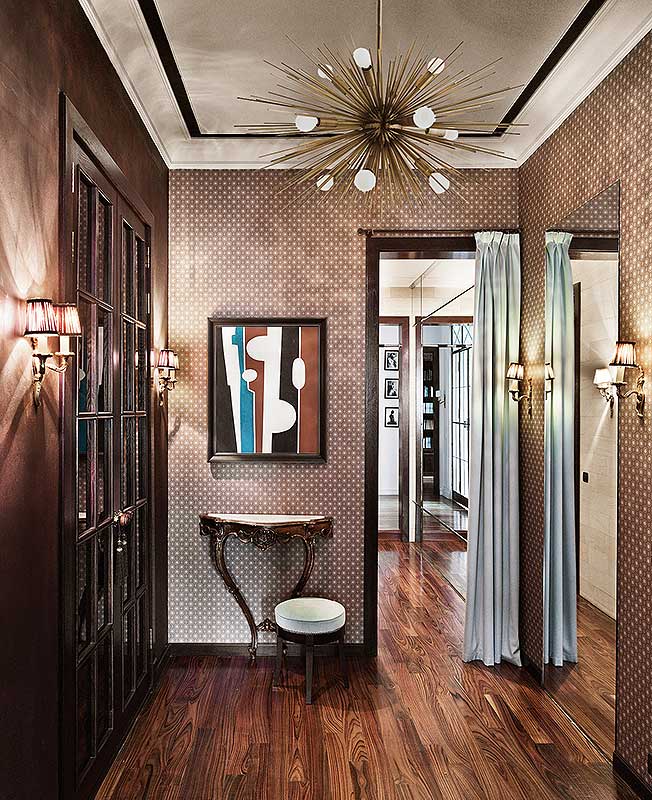 Прихожая. Винтажная люстра Sputnik, антикварная консоль. Пуф Baker. Картина французского художника Э. Леви.
