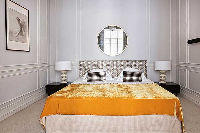 Синий оттенок, который автор использовал на полотне (и которому вторит композиция шаров на камине), очень нравится Марине. Он известен в мире как International Klein Blue (IKB) — «Международный синий Кляйна»: его запатентовал француз Ив Кляйн в 1962 году. В гостиной задает тон фоторабота Оливье Дассо — художника, который в равной степени знаменит и как политик. В комнате сына — работа в стиле Бэнкси. Этот автор, ни настоящее имя, ни биография которого неизвестны, признан лучшим граффитистом мира.