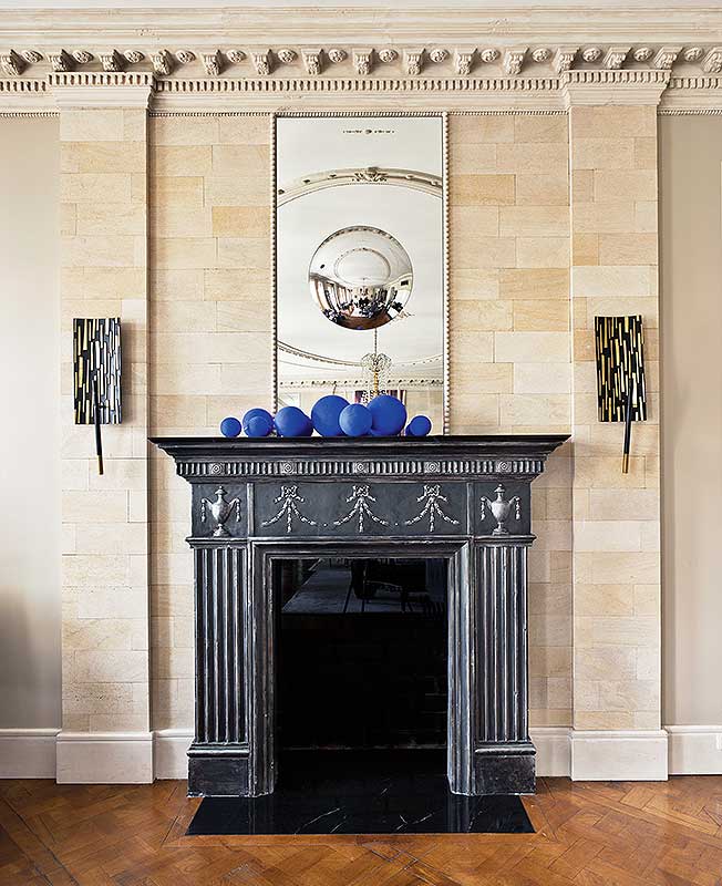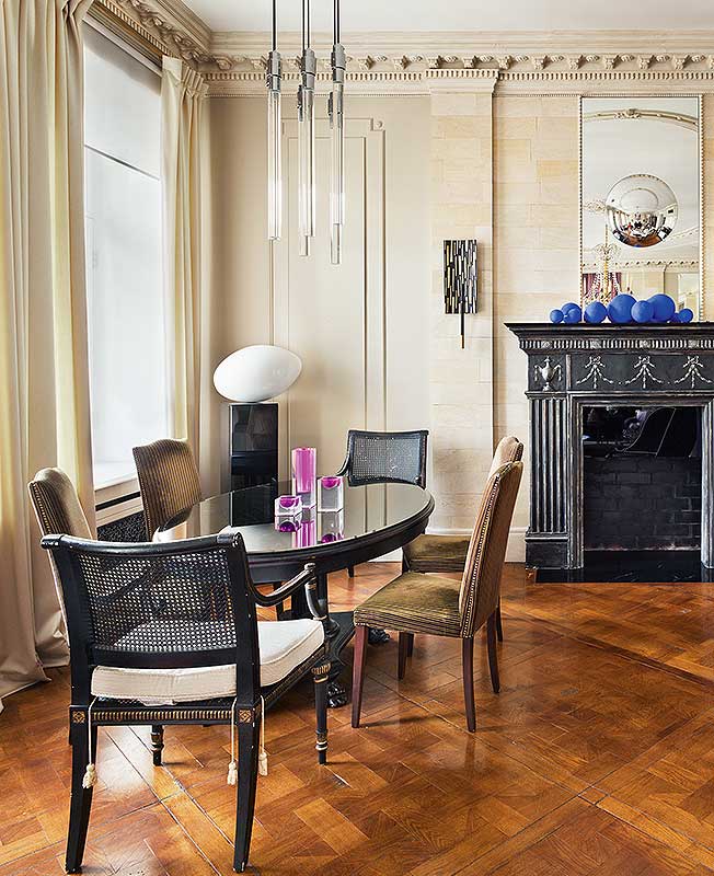 В гостиной диалог ведут картина В. Михайлова и композиция из шаров на камине: их объединяет цвет. Стулья и диван Baker.