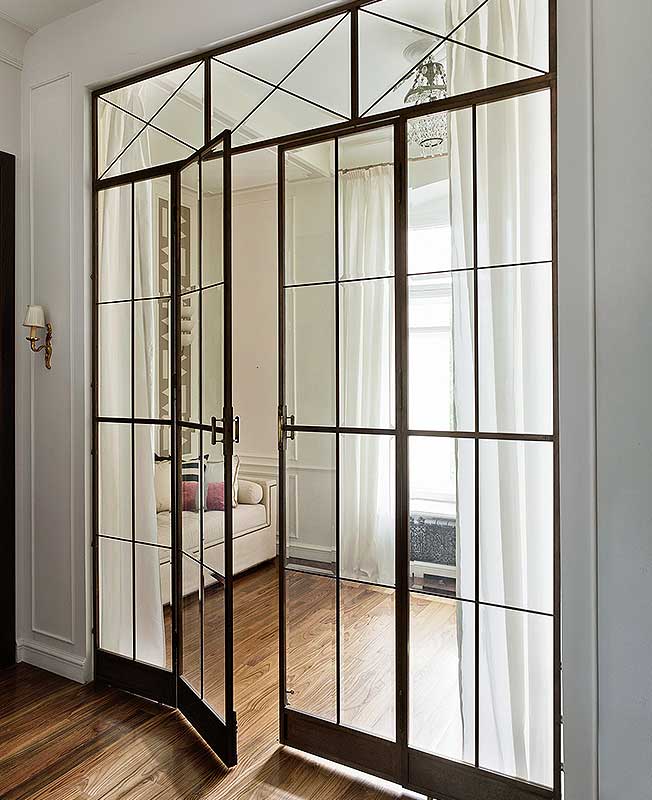 Гостевая комната отделена от коридора перегородкой из латуни и фацетированного стекла.