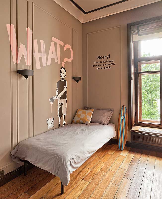 В комнате сына — граффити в стиле Бэнкси. «Долгое время не могла найти идеального решения для комнаты подростка, пока он сам не познакомил меня с творчеством этого загадочного мастера стрит-арта», — вспоминает Марина.