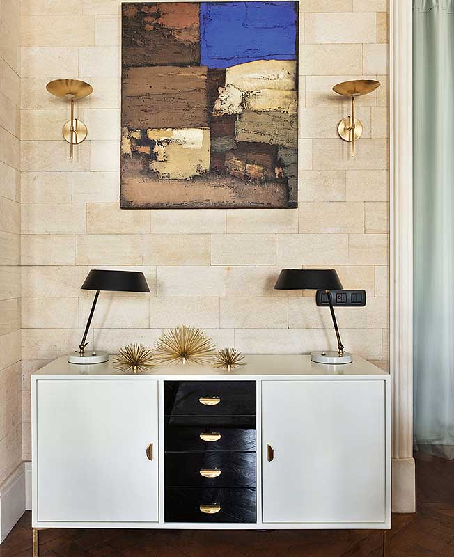 На комоде, отделанном пергаменом (диз. М. Филиппова), — светильники Stilnovo 50-х.