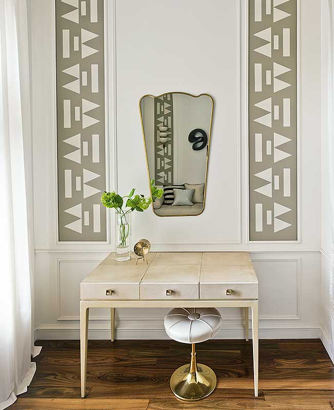 Гостевая комната. Туалетный винтажный столик 50-х отделан пергаменом. Зеркало в латунной раме выполнено на заказ. В нем отражается скульптура М. Расмуссен и раскладная кушетка, диз. М. Филиппова. Роспись на стенах выполнена по трафарету.