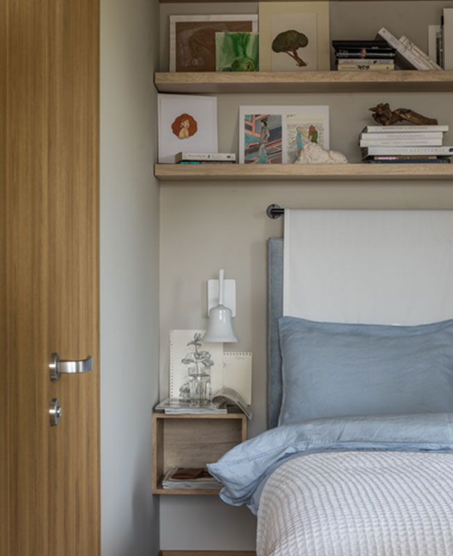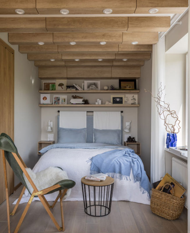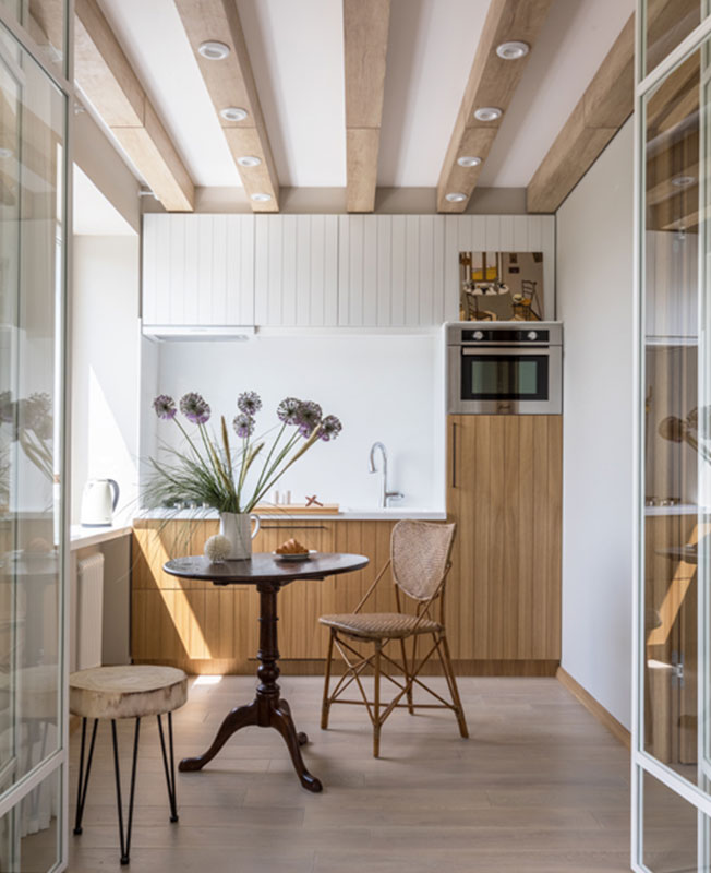 Пространство отличается экологичностью. В квартире использовали большое количество натуральной фактурной древесины — потолок, книжные полки, тумбы и др. Образ дачи или загородного дома подкрепили палитрой натуральных нейтральных оттенков и простым текстилем (лен, хлопок).