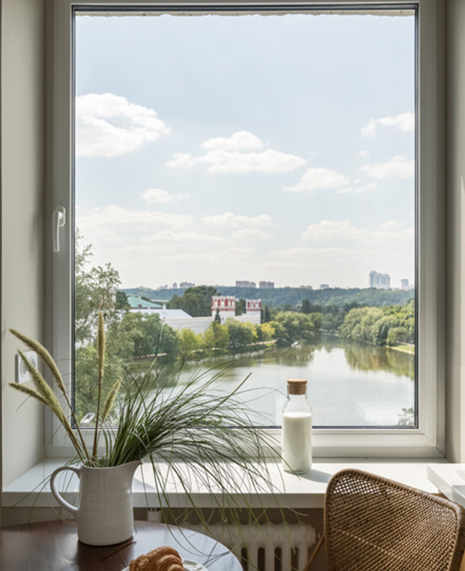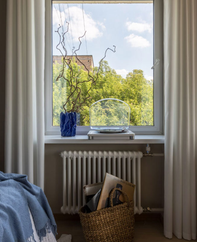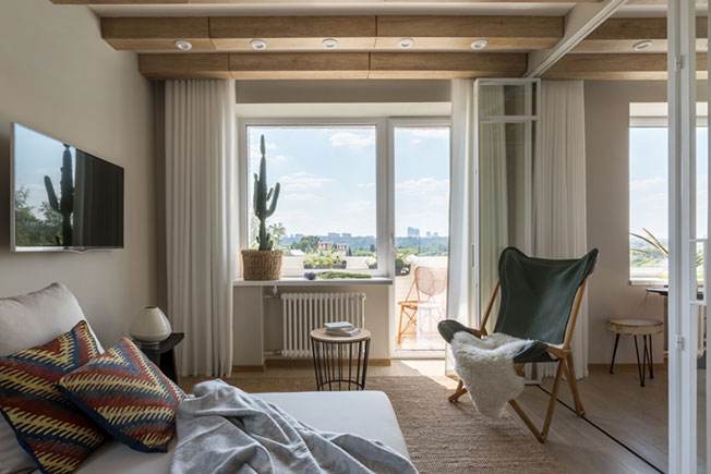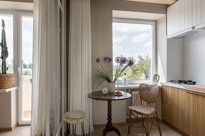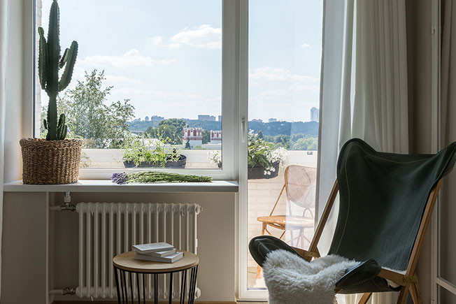 Открывающийся вид приводил в восторг каждого от замерщика окон до монтажника охранной сигнализации. Рядом расположен зеленый парк с рекой, многоэтажные дома находятся так далеко, что не портят панораму. «Мы хотели продолжить тему расслабляющей окружающей природы, которая бы успокаивала, располагала к отдыху: почитать, поваляться, посмотреть в окно. Мы хотели, чтобы квартира получилась простой, уютной, с природными акцентами», — рассказывает Анастасия.