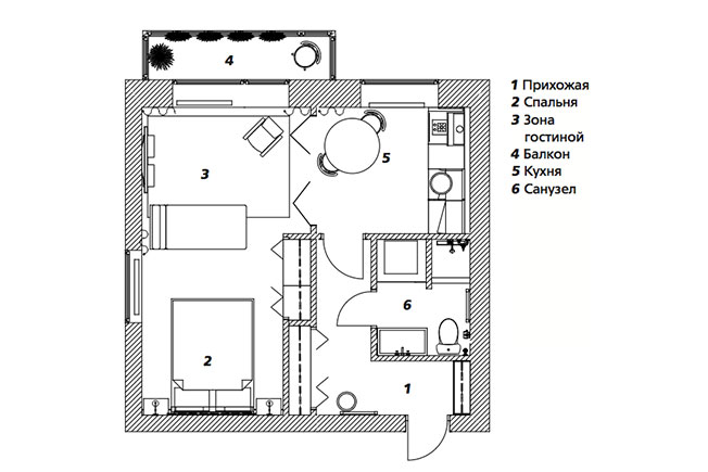 При перепланировке кухня стала проходной, от жилой комнаты помещение отделено легкой стеклянной перегородкой. Стена, разделяющая коридор гостиную-спальню оборудована нишами под шкафы для хранения.