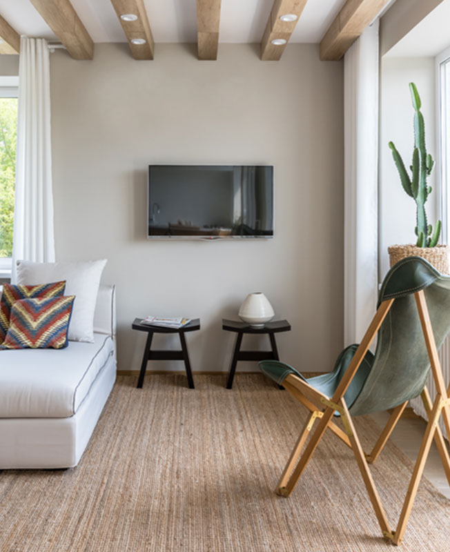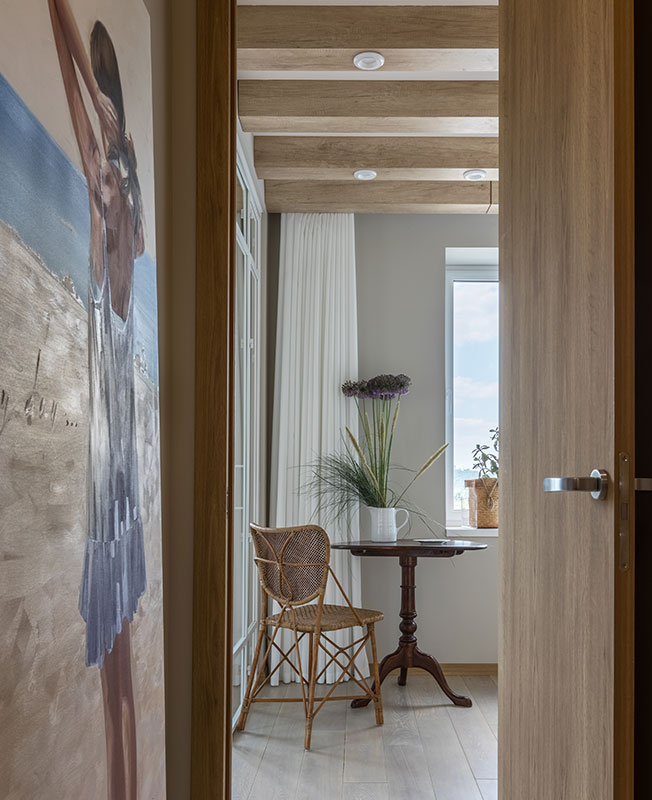 Квартира также тяготеет и к средиземноморскому интерьеру — в комнатах всегда много света, потолок оформлен выразительными деревянными балками, повторяющийся ритм которых зрительно увеличивает помещения. В интерьере много кашпо для цветов, корзин, на полу лежат циновки.