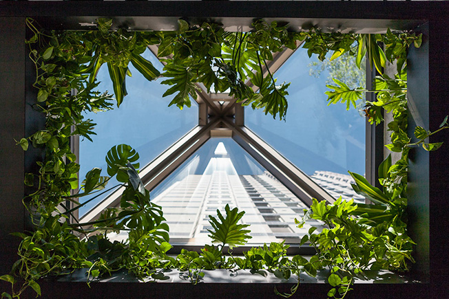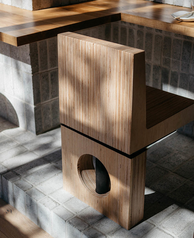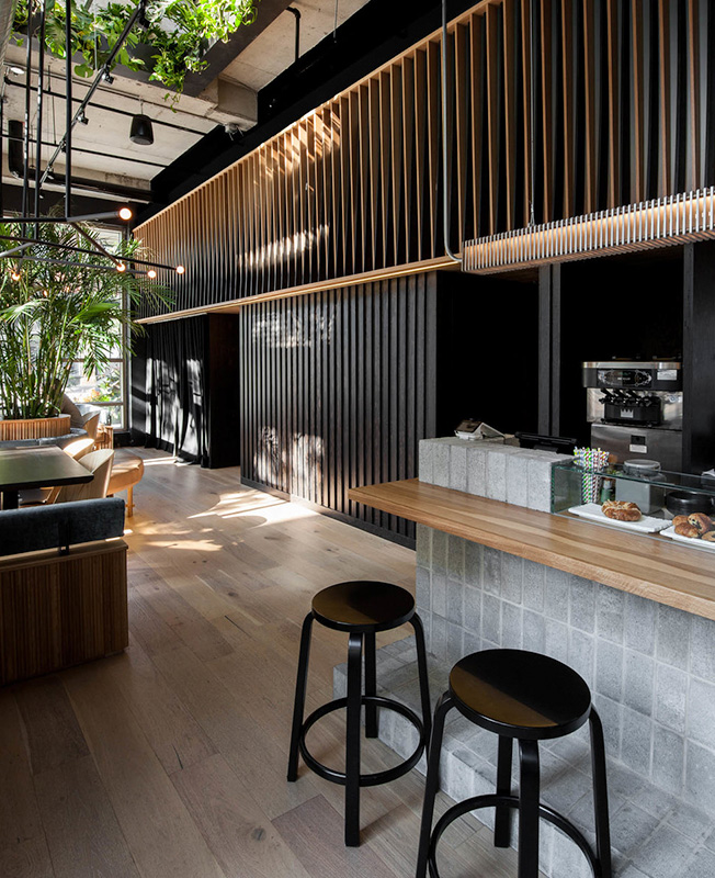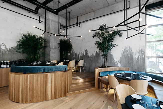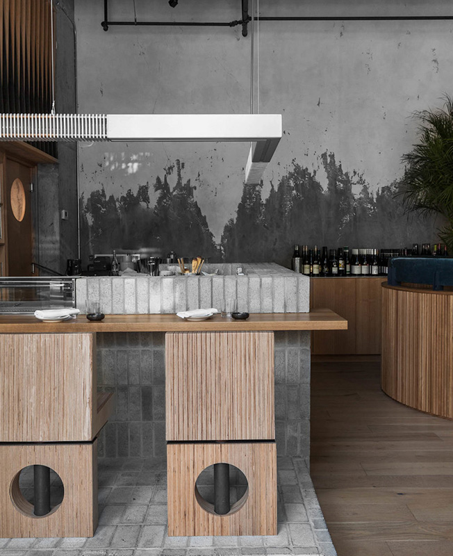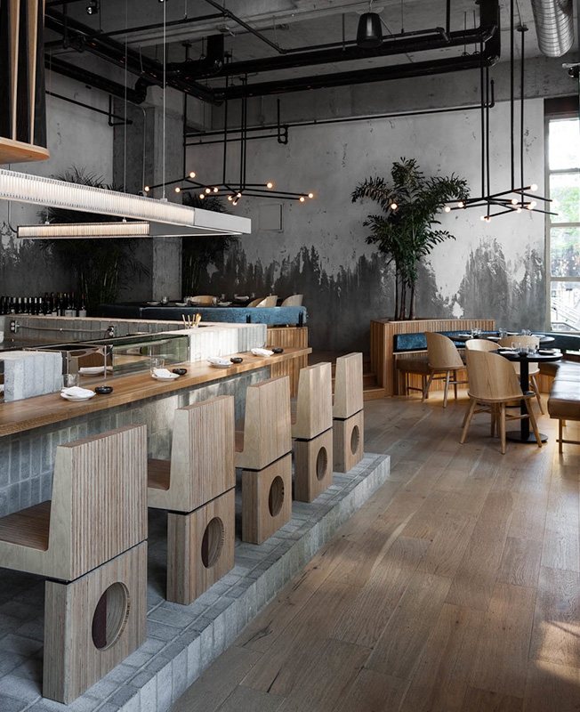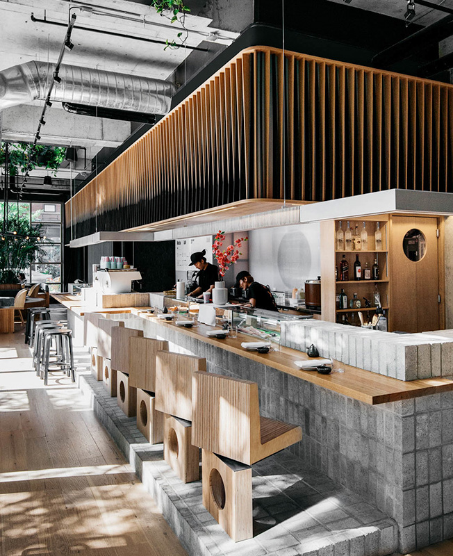 Суши-бар из бетонных блоков сочетется с консольными деревянными вращающиеся стулья. Висячие растения обозначают в общих чертах два больших окна в крыше, которые не только дарят пространству больше естественного света, но и помогают росту растений.