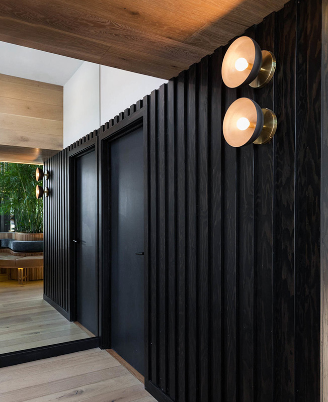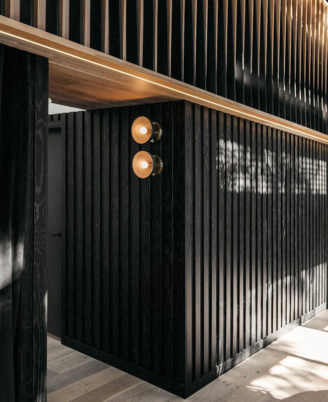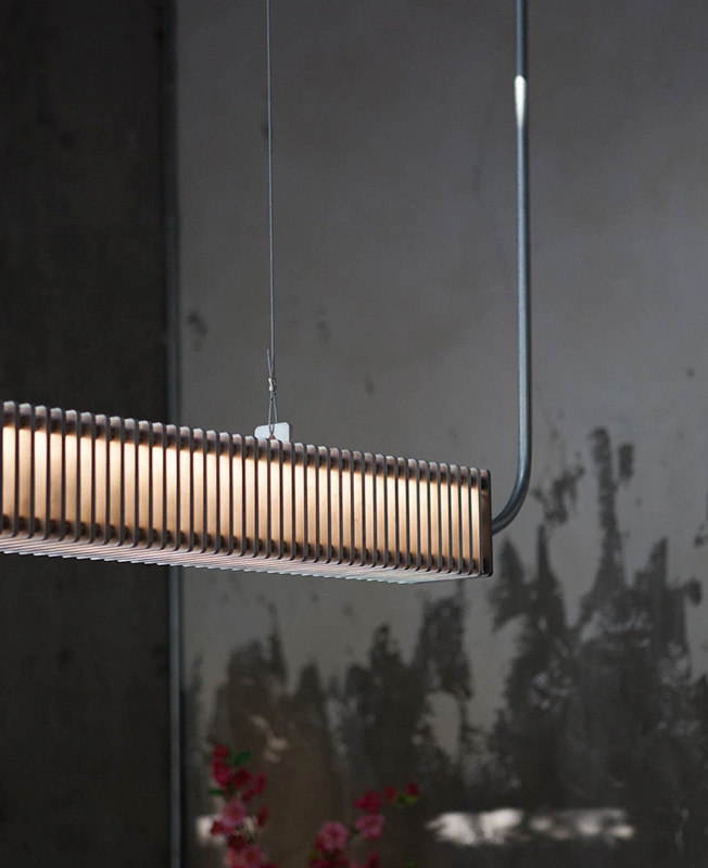 Игра светлых и темных оттенков деревянных реек создает оптический эффект и придает динамику пространству. Подвесной светильник повторяет форму стойки, которая была изготовлена из 467 алюминиевых и 1868 медных деталей.