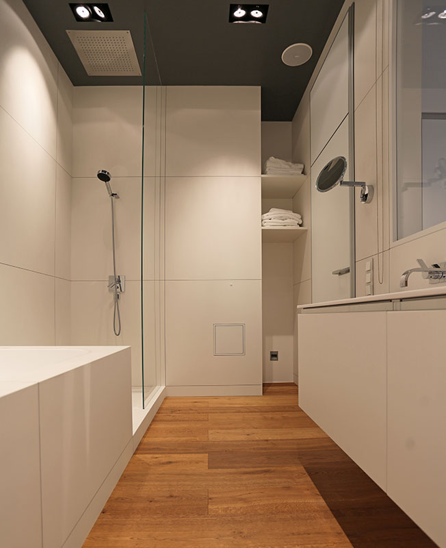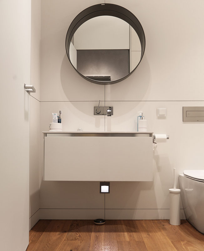 Дизайн визуально расширяет пространство. Стеклянный проем между спальней и ванной придает глубину и выразительность обоим помещениям. Например, по утрам в ванной можно наслаждаться естественным светом, а вечером — воспользоваться подсветкой из спальни.