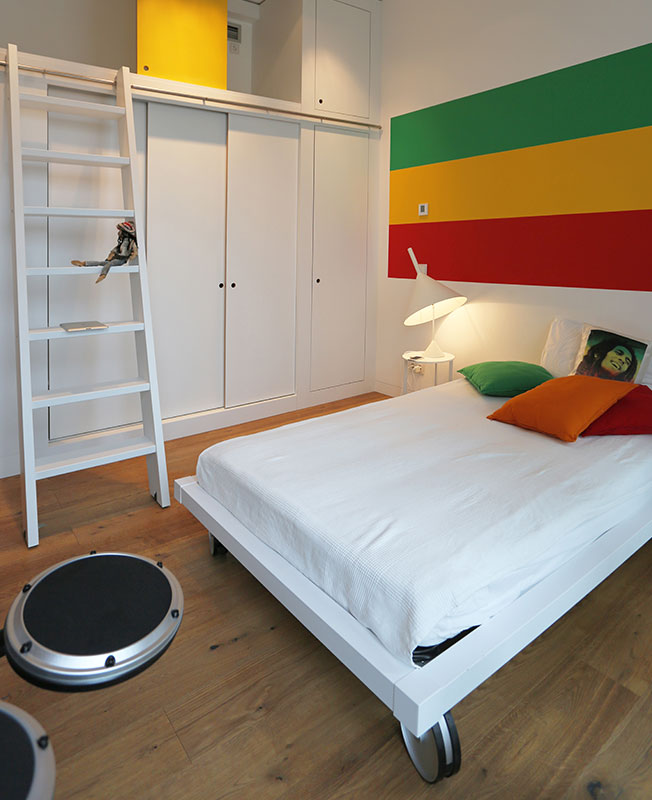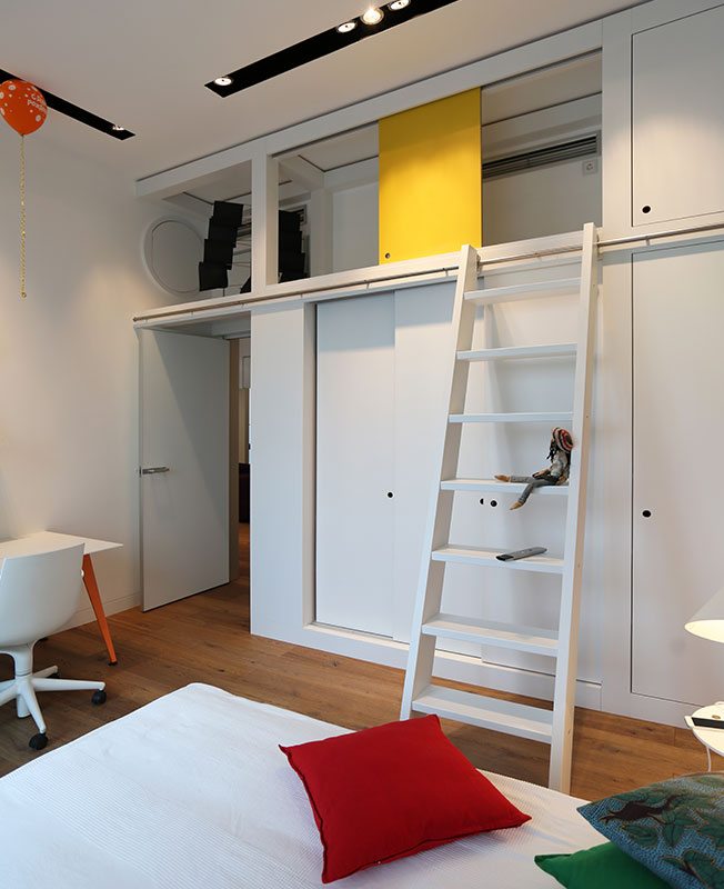 Интересный сценарий был придуман для детских комнат. По нашим чертежам была изготовлена система хранения, совмещенная с игровым комплексом. Особенностью стала общая антресоль на две детские с дополнительными спальными местами. На галерею ведут две передвижные лестницы. По антресоли через круглый люк в стене можно попасть из одной детской в другую».