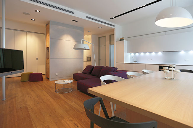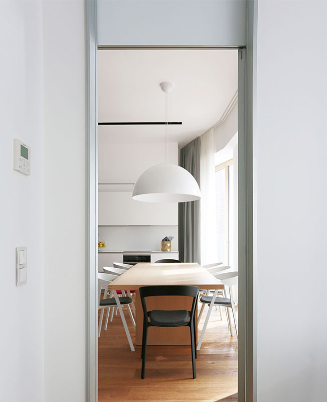 Евгения и Александр Головины в московской квартире площадью 136 кв. метров создали для пары с детьми уютное лаконичное пространство, в котором каждый член семьи чувствует себя комфортно. По желанию заказчиков архитекторы сосредоточились на планировочном решении с общим открытым пространством, функциональным зонированием, большим объемом встроенного оборудования и техники. О проекте рассказывают сами авторы. nonenonenonehttps://golovingolovin.wixsite.com/jenya Фрагмент столовой. Стулья, Kristalia. Обеденный стол, Maxalto. «Дизайн-концепция стала совокупностью приемов, поддерживающих архитектуру квартиры. Белый цвет послужил контрастной изнанкой брутальным кирпичным фасадам здания. Дополнением стал паркет естественных оттенков. Развиджные двери, Rimadesio. Напольный светильник, Vertigo Bird. Встроенный свет, B.LUX. Объединенная гостиная-кухня-столовая. Диван, журнальный столик, пуфы, B