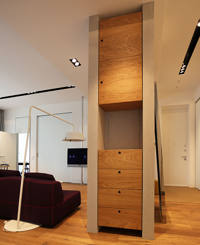 Большая гостиная совмещает в себе функции столовой и кухни. Бетонная перегородка с модулями встроенной мебели из древесины конструктивно и визуально разделяет общую и входную зону.