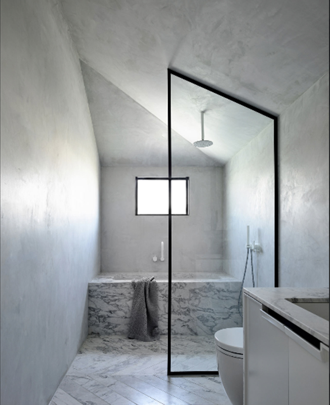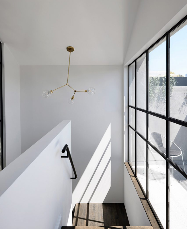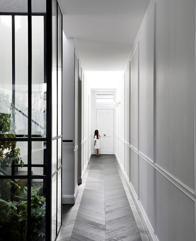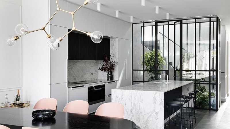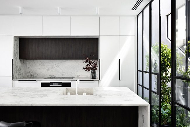 Студия Biasol хотела создать атмосферу традиционной парижской квартиры. Здание, в котором предстояло реализовать задуманное, стоит в австралийском Мельбурне. Оно построено в духе итальянского стиля с причудливыми чугунными кружевами на фасаде, популярного здесь в конце XIX века. Жан-Пьер Биасоль, основатель студии (c 2012 г.) говорит, что проект Casa Atrio отдает дань классической красоте итальянской архитектуры и романтике французского дизайна. В центре дома находится атриум, наполненный зелеными растениями. Полы выложны классической французской елкой или шевроном. Длинный коридор ведет от входной двери к жилой зоне, которая выходит в небольшой внутренний двор. Выход оформлен высокими застекленными дверями. За атриумом — множество ступеней, ведущих к спальням. Еще одна панель остекления встроена в эту лестницу, с которой хорошо просматривается небольшая терраса позади дома. Мебель в духе mid-century modern украшает пространство, включая темно-синий бархатный диван, черный обеденный стол и медную лампу в форме созвездия. На кухне — столешница из белого мрамора слегка нависает над островом для завтрака. В главной спальне бархатное изголовье изгибается вокруг всей задней стены. Изумрудно-зеленый мрамор подчеркивает изящество туалетного столика и акцентирует нишу в смежной ванной комнате. Здесь душевая перегородка в черной раме напоминает внешний вид атриума.