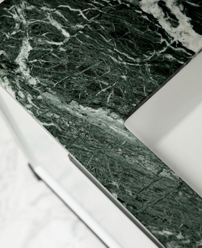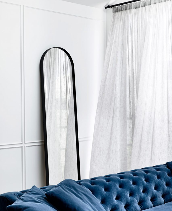 В главной спальне бархатное изголовье изгибается вокруг всей задней стены. Изумрудно-зеленый мрамор подчеркивает изящество туалетного столика и акцентирует нишу в смежной ванной комнате. Здесь душевая перегородка в черной раме напоминает внешний вид атриума.
