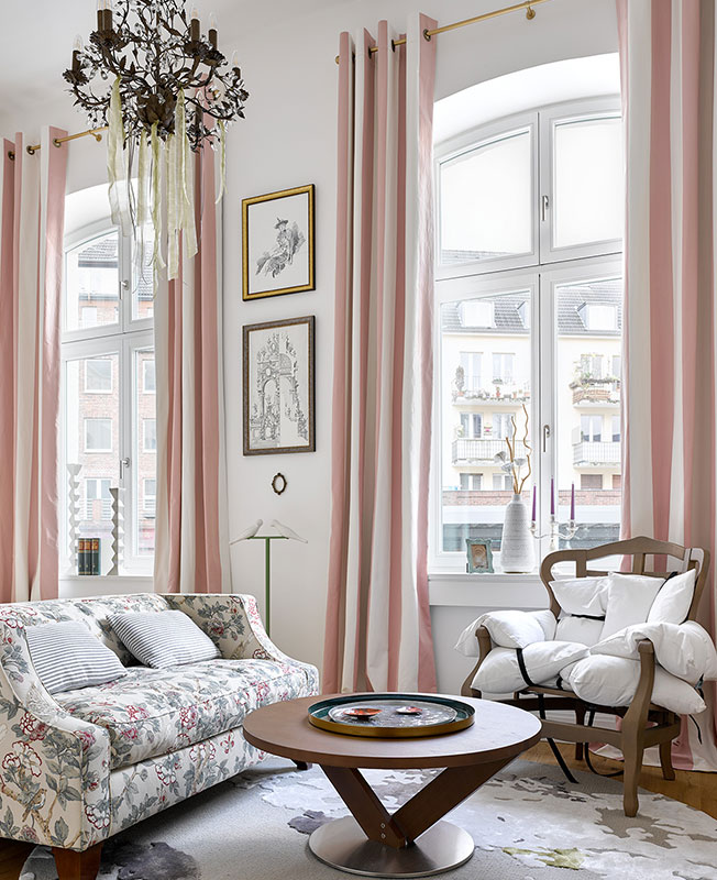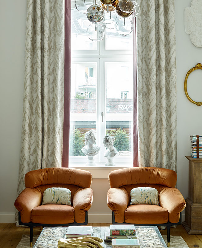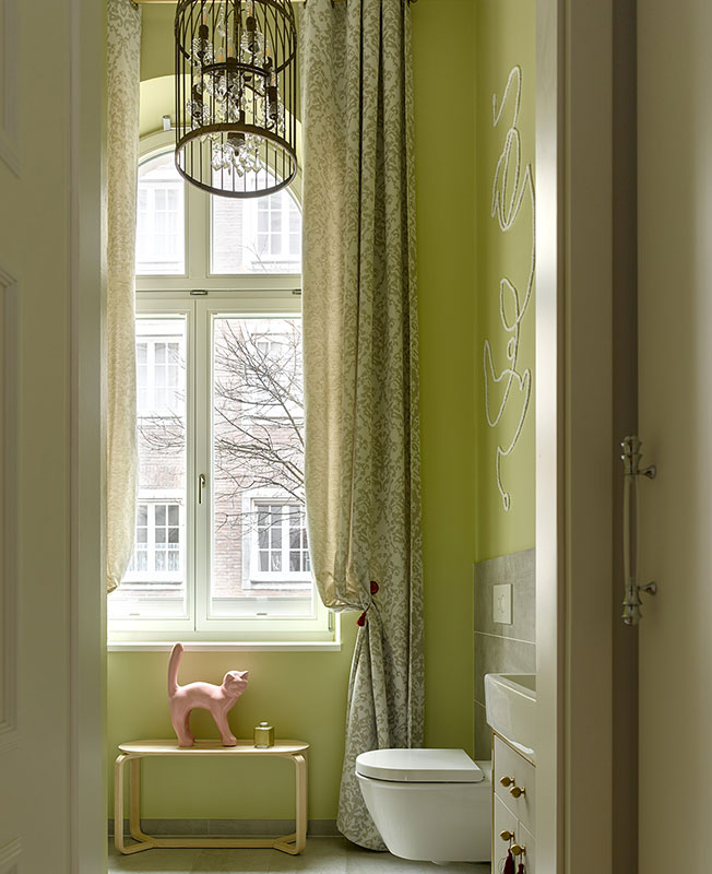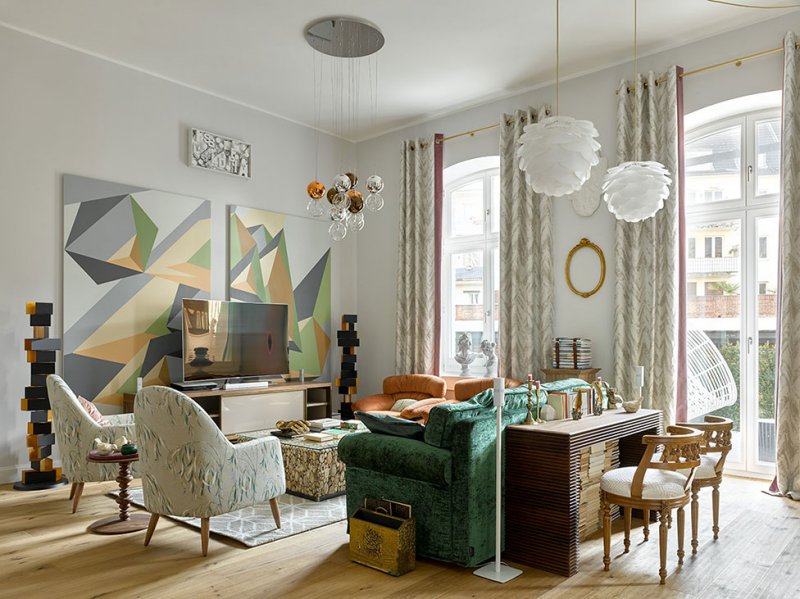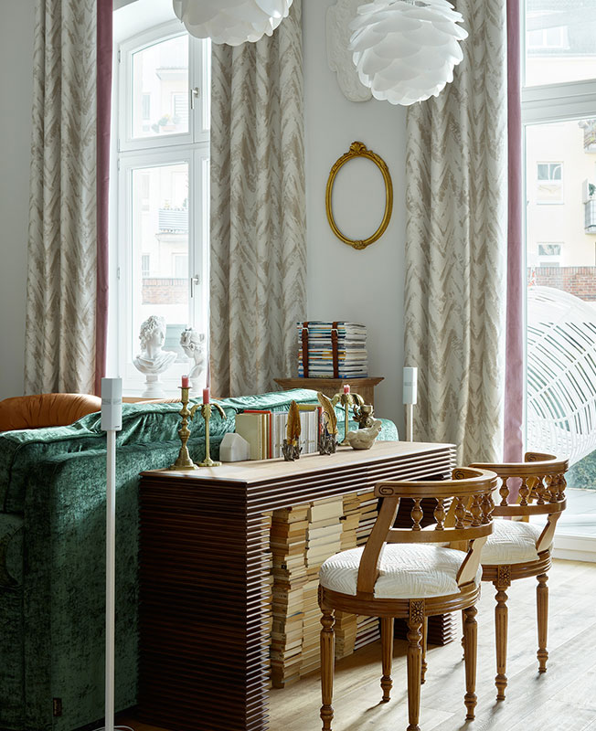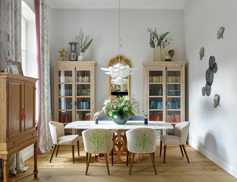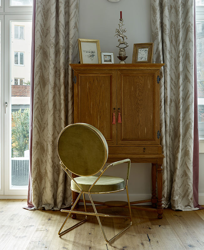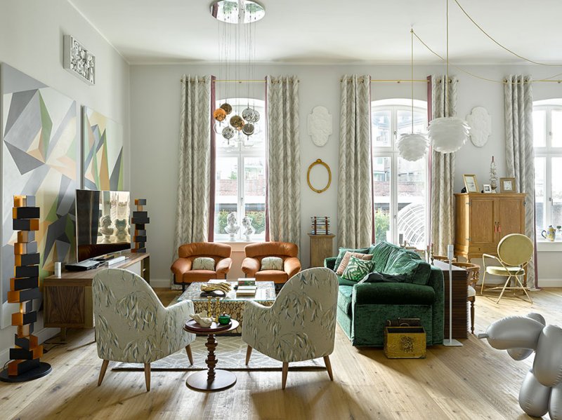 «В результате мы подобрали стилистическое решение, основанное на возможности работать только с мебелью и традиционной архитектурой здания — четырехметровыми потолками, арочными окнами. За основу взяли существующие нейтральные стены, добавив к ним микс мебели в современном и классическом стиле, вполне в духе района Альтштадт.
