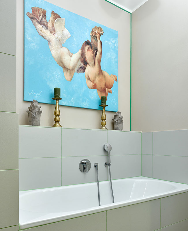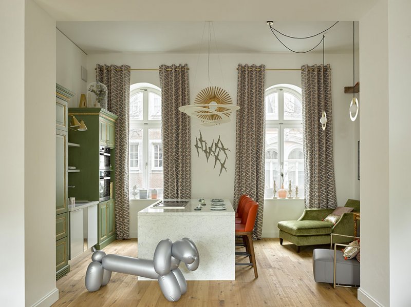 Илья и Светлана Хомяковы, студия QuatroBase, завершили для своих давних заказчиков уже четвертый по счету проект. На этот раз архитекторы оформили квартиру для сдачи в аренду в Дюссельдорфе, Германия. Апартаменты 140 кв. метров находятся в псевдо-готическом здании бывшей школы 1905-го года постройки. В 2015-2017 годах дом был реконструирован в жилой комплекс. Владельцы приобрели квартиру специально под сдачу и хотели, чтобы концепция интерьера перекликалась с окружающей бурной жизнью за окном. Дом расположен в районе Альтштадт, где историческая застройка перемежается с современными зданиями из стекла и бетона. Гостиная. Тумба для ТВ, Casa Furniture. Картины, Алексей Kio. Бронзовая газетница найдена на блошином рынке в Дюссельдорфе. Гостиная. Люстра, Cattelan Italia. Серые кресла, Mobi. На полу состаренная дубовая доска. Согласно европейским стандартам, квартиру получили уже с отделкой (как правило, она нейтральная). Заказчики хотели апартаменты для высокоуровневой сдачи — нужен был яркий запоминающийся образ, но без капитального ремонта. В квартире не была снесена ни одна стена, но все же нашлось место для небольшой перепланировки: кухню с гостиной поменяли местами. nonehttps://www.instagram.com/ilya_khomyakov/https://www.facebook.com/quatrobase/www.4base.ru Фрагмент гостиной. Консоль, Porada. Подвесные светильники, Vita. «В результате мы подобрали стилистическое решение, основанное на возможности работать только с мебелью и традиционной архитектурой здания — четырехметровыми потолками, арочными окнами. За основу взяли существующие нейтральные стены, добавив к ним микс мебели в современном и классическом стиле, вполне в духе района Альтштадт. Фрагмент гостиной. Кресла, Casa Furniture. Акцент сделали на художественном оформлении. К базовой гамме добавили зеленый в различных оттенках и совсем немного контрастных тонов. Получилось ярко, но в тоже время сдержанно и благородно», — рассказывают о проекте Илья и Светлана. Столовая зона. Обеденный стол, Porada. Обеденные стулья, Mobi. Светильник, Normann Copenhagen. Гостиную разделили на три функциональные зоны. Слева расположилась масштабная диванная группа, по центру — компактная рабочая зона с секретером и стулом Double Zero по дизайну Дэвида Аджайе для Moroso. В основе силуэта предмета — «двойной ноль» круглой спинки и сиденья. Интересно, что каркас представляет собой единый латунный контур, обрамляющий подушки, образующий ножки и подлокотники. Рабочая зона. Стул Double Zero, диз. Дэвид Аджайе, Moroso. Справа разместилась обеденная группа со столом на шесть человек. Деление гостиной на три зоны подчеркнуто светильниками. Помимо просторной гостиной апартаменты также включили кухню, две спальни, два санузла и прихожую со встроенными системами хранения. Кухня. Гарнитур с островом из искусственного камня выполнен по эскизам архитекторов, Италия. Надувная собака, Fatboy. Кухня. Барные стулья, Cattelan Italia. Люстра над островом, Artemide. Фрагмент кухни. Подвесные светильники, Wishnya. Напольный светильник, Cattelan Italia. Фрагмент кухни. Кушетки, Flexform. Архитекторы хотели создать, в первую очередь, домашнюю уютную атмосферу. Всем хотелось, чтобы квартира выглядела обжитой. Акцент был сделан на художественном оформлении — в гостиной появились гипсовые барельефы, множество произведений современного искусства, включая и авторские, особое внимание уделили текстилю. Почти вся обивка мебели была заменена на ткани и