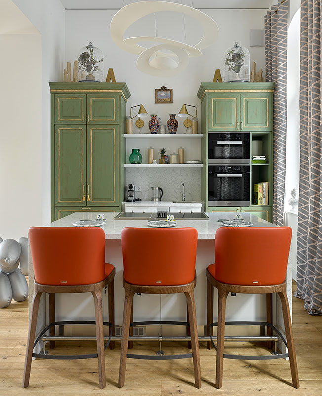 Акцент сделали на художественном оформлении. К базовой гамме добавили зеленый в различных оттенках и совсем немного контрастных тонов. Получилось ярко, но в тоже время сдержанно и благородно», — рассказывают о проекте Илья и Светлана.