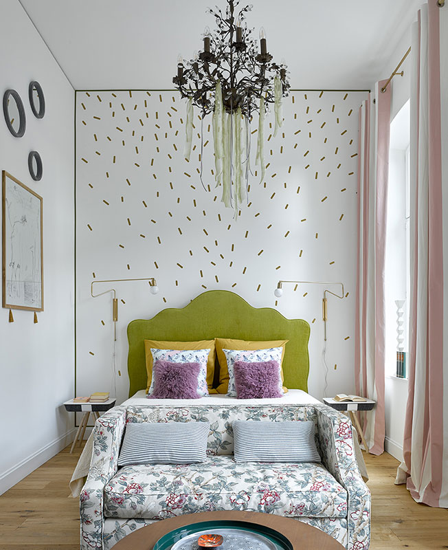 Главная спальня. Люстра, Casa Ambiente. Композиция на стене за кроватью выполнена с помощью виниловых наклеек по эскизам архитекторов.