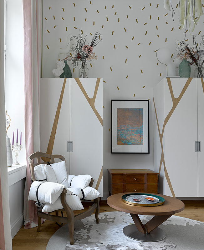 Архитекторы хотели создать, в первую очередь, домашнюю уютную атмосферу. Всем хотелось, чтобы квартира выглядела обжитой. Акцент был сделан на художественном оформлении — в гостиной появились гипсовые барельефы, множество произведений современного искусства, включая и авторские, особое внимание уделили текстилю. Почти вся обивка мебели была заменена на ткани из коллекций европейских брендов.