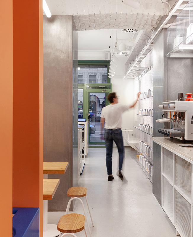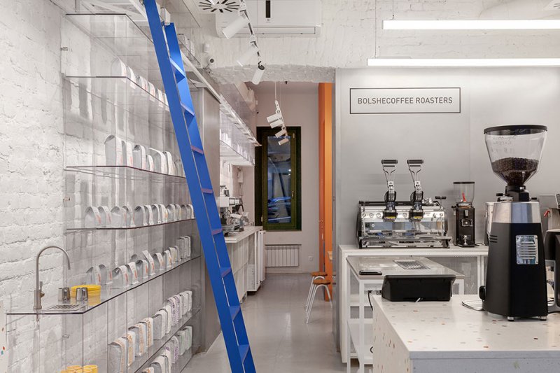 В Санкт-Петербурге открылось новое заведение для поклонников кофе Bolshecoffee Roasters. Здесь есть на что посмотреть и любителям дизайна — минималистичным интерьером кофейни занимались архитекторы Ольга Кулиш, Владимир Спакис, Дмитрий Каменский (студия AKME). На компактной площади всего 43 кв. метра удалось создать по-настоящему многофункциональное пространство. Авторы проекта смогли разместить магазин, кафе и место для проведения каппингов (профессиональная дегустация кофе). nonehttps://www.instagram.com/akme.work/nonenone Пространство может трансформироваться, в зависимости от ситуаций. Мобильной стол в центре помещения можно использовать во время мероприятий или отодвинуть в дальний зал, чтобы освободить место для общения с покупателями. В заведении также расположен небольшой демонстрационный стенд с оборудованием. Передвижная металлическая лестница акцентного синего цвета и стеллажная система из прозрачного поликарбоната созданы по эскизам архитекторов. Такое решение позволило максимально расширить выставочную зону, при этом визуально не утяжелив конструкцию. Светлые нейтральные оттенки сбалансированы яркими акцентами, которые объединяют пространство двух залов в единое целое и создают настроение праздника, которое так необходимо в Петербурге. Вся мебель в интерьере разработана архитекторами AKME и изготовлена на заказ. Бетонные фасады барной стойки, скамейки, столешницы и ультрамариновая раковина выполнены командой Lick my brick и Delo design. Графическим оформлением занималась Ann Opsteine. • Санкт-Петербург, улица Марата, 22-24.