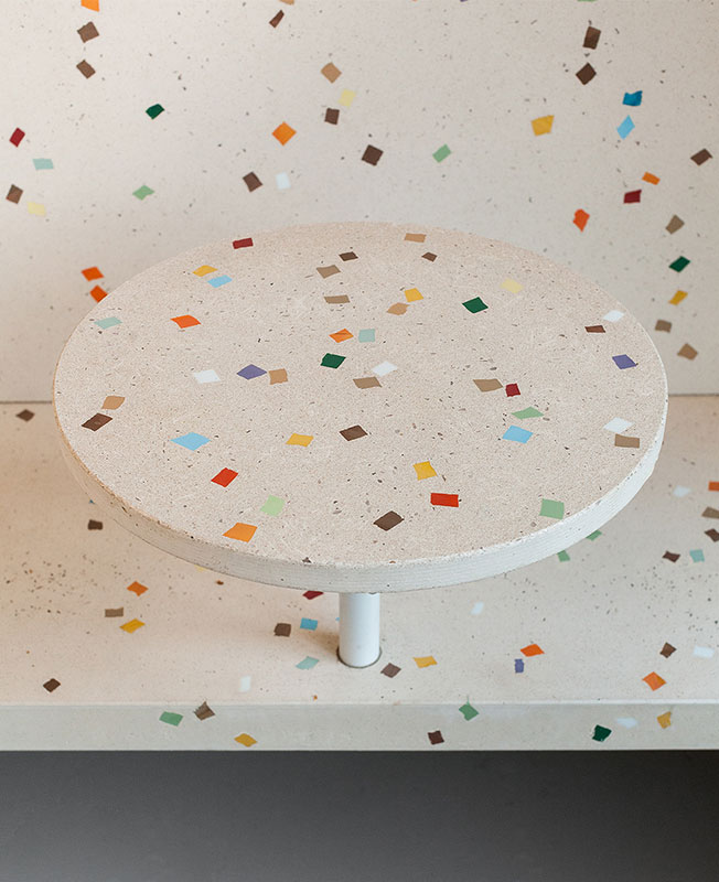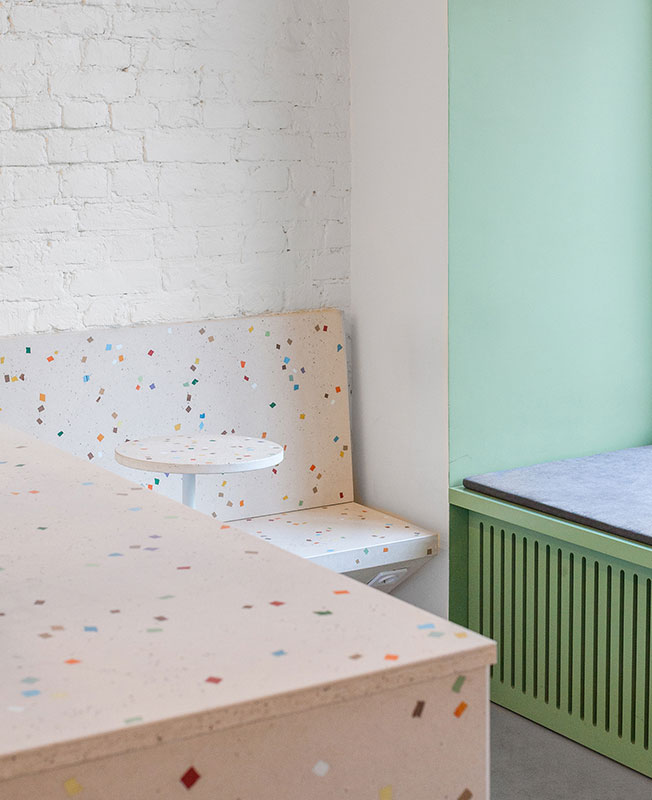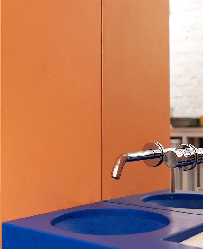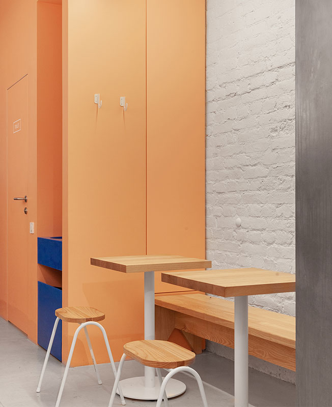 Вся мебель в интерьере разработана архитекторами AKME и изготовлена на заказ. Бетонные фасады барной стойки, скамейки, столешницы и ультрамариновая раковина выполнены командой Lick my brick и Delo design. Графическим оформлением занималась Ann Opsteine.