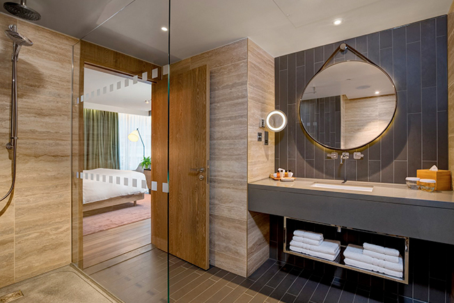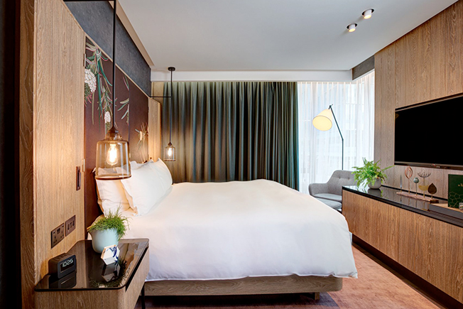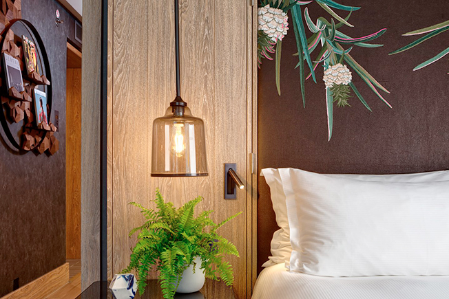 Большая часть поверхностей отделана тканью Pinatex. Эта альтернатива коже изначально была разработана компанией Ananas Anam, а основой для нее послужили целлюлозные волокна, получаемые из отходов — обрезков листьев ананаса. Этот материал — еще и отсылка к местной истории: когда ананасы впервые появились в Лондоне, они продавались на рынке Боро в нескольких минутах ходьбы от отеля. Pinatex покрывает серо-серые сидения, ярко-красные подушки и расшитое цветами изголовье по дизайну художницы Эмили Поттер (Emily Potter).