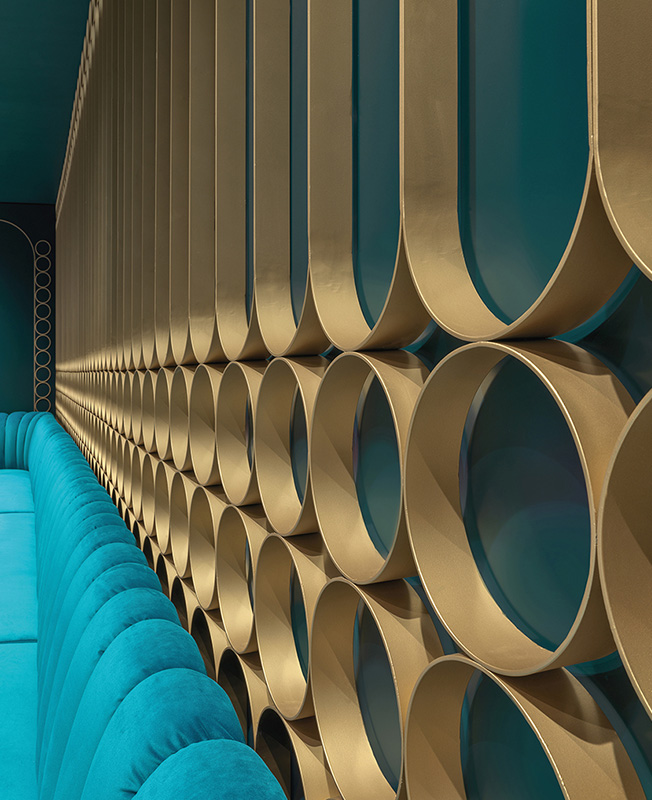 Интерьеры объединяет мотив круга: он повсюду, от тонких и арочных фризов до разноцветного буазери и изогнутых опор барной стойки. Специально разработанная для проекта мебель украшена металлическими деталями в популярной эстетике mid-century modern.