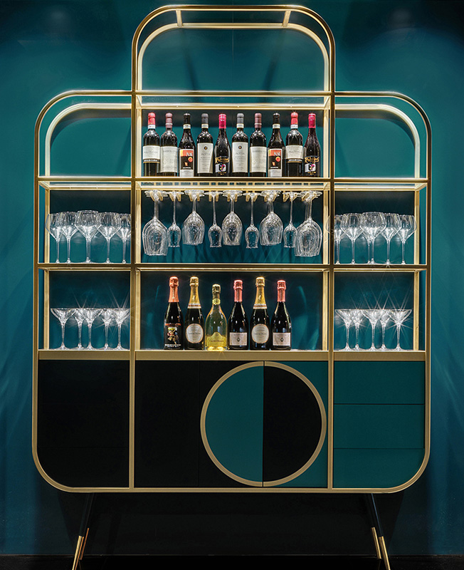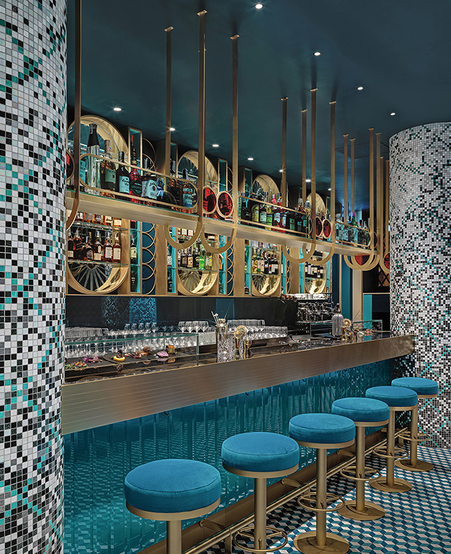 Массивные колонны, покрытые мозаикой (Trend Group S.p.A.), пронизывают длинный прилавок с бирюзовым зеркальным покрытием, где на латунной столешнице шустрые бармены смешивают свои коктейли.