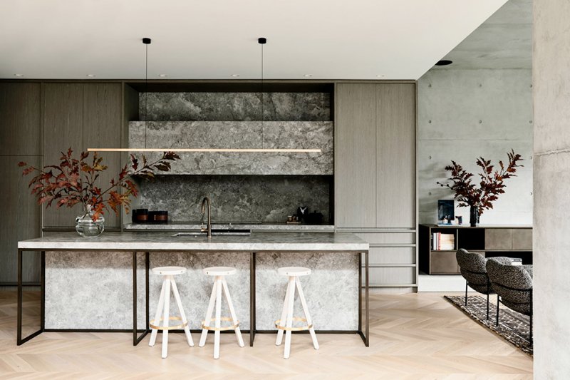 «Наш подход был очень продуманным и вне рамок моды. Связь между самим зданием и его обитателем основана на строгом исследовании масштаба, формы, пространства и материала. Тонкая палитра материалов и сложные детали создают ощущение элегантности и роскоши», — говорит директор студии Workroom, архитектор Джон Борнас.
