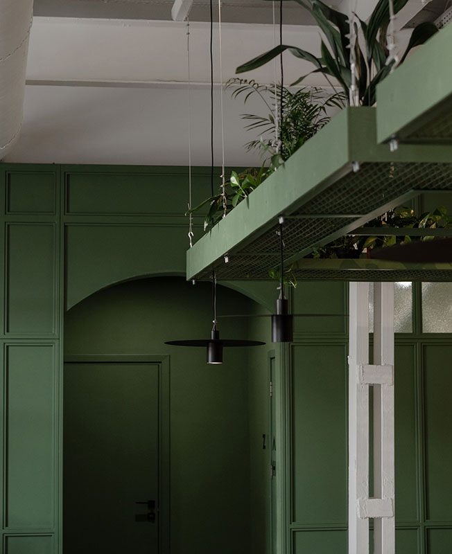 Всплески зеленого цвета в светильниках, стенах и архитектурных элементах также апеллируют к юности, молодой траве и ссылаются на название этого уютного гостеприимного заведения.