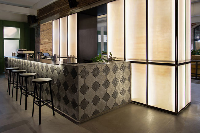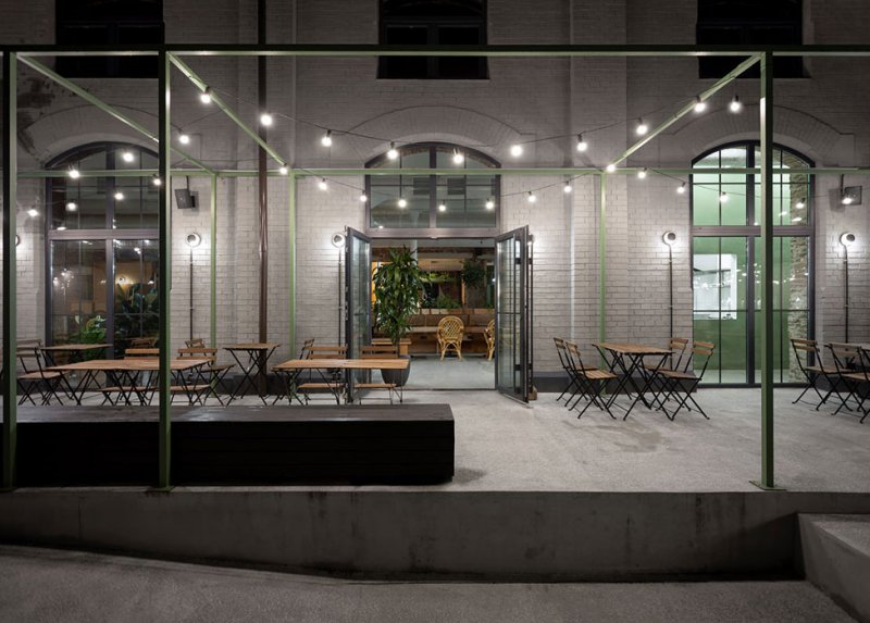 Архитекторы решили визуально связать внешнюю и внутреннюю часть заведения. Исторические архитектурные элементы были сохранены и гармонично интегрированы в пространство. Оригинальный тротуар во дворе стал основой для открытой террасы, красная кирпичная кладка подчеркнула связь интерьера и экстерьера, а также стала выразительным фоном для предметов мебели.