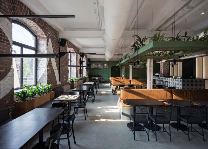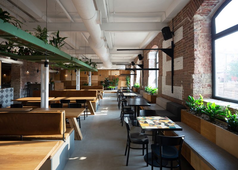 Бывшее промышленное здание превратилось в жизнерадостный интерьер, в котором можно с удовольствием провести целый день, не ощущая типичную атмосферу питейного заведения.