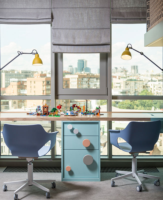 Рабочие места расположены у окна с панорамным видом на город. Светильники, Lampe Gras.