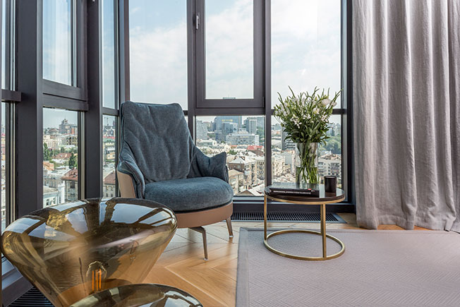В квартире очень много естественного света, благодаря большим панорамным окнам, которые также дают возможность любоваться захватывающими видами Киева. Очень светлой получилась обеденная зона. Проникающий солнечный свет эффектно бликует и отражается в латунных поверхностях мебели и светильников.