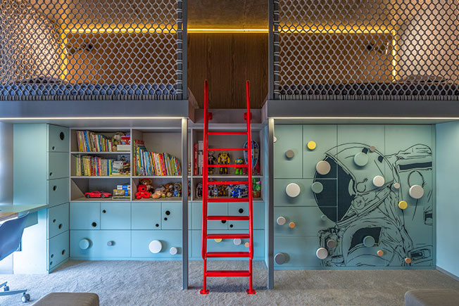 В детской комнате предусмотрены два спальных места на потенциальное будущее пополнение в семье. Кровати расположены на втором ярусе, под ними оборудованы шкафы и книжные полки. Сочетание лазурного синего с красным, канатная сетка-ограничитель, позитивные ручки секций хранения и принт на фасадах шкафов привносят динамику в помещение, столь необходимую и любимую детьми.