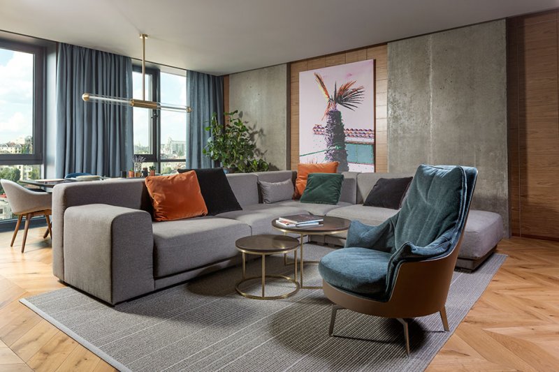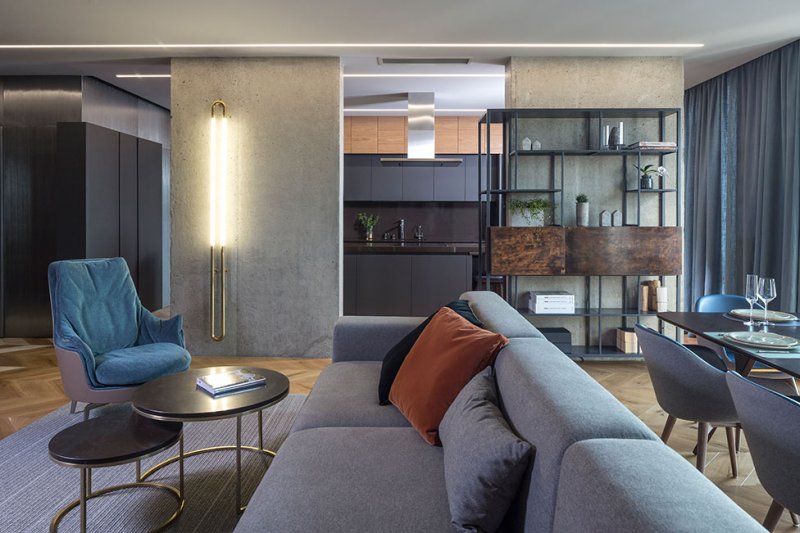 Елена Добровольская (архитектурная студия DreamDesign) спроектировала в Киеве просторную квартиру 140 кв. метров для молодой пары с ребенком. Основным пожеланием заказчиков был современный интерьер, располагающий к отдыху. Квартира получилась именно такой, какую и хотели владельцы. Спокойное, выдержанное в современной эстетике пространство. «Сложные пастельные оттенки, большое количество латуни, контрастные комбинации металла и древесины, предметы мебели и освещения с лаконичными силуэтами, разнообразный текстиль — все это гармонично сочетается между собой и формирует единую композицию», — комментирует проект Елена. Гостиная. Кресло, Flexform. Картина, Олег Тистол. Вид из гостиной на кухню. Кухня визуально отделена от пространства гостиной-столовой бетонными пилонами. Квартиру разделили на общественную зону (гостиная-столовая-кухня) и приватное пространство со спальней и детской комнатой. В интерьере дизайнер придерживалась натуральных текстур: дубовый пол, камень, текстиль и брашированная сталь. Тепло деревянных поверхностей подчеркивают брутальные бетонные конструкции. Фрагмент гостиной. На переднем плане светильники, Brokis. Панорамные окна дают много естественного света. nonenonehttps://www.facebook.com/elena.dobrovolska.7https://www.dobrovolska.com/ В квартире очень много естественного света, благодаря большим панорамным окнам, которые также дают возможность любоваться захватывающими видами Киева. Очень светлой получилась обеденная зона. Проникающий солнечный свет эффектно бликует и отражается в латунных поверхностях мебели и светильников. Спальня. Напольный светильник, Catellani
