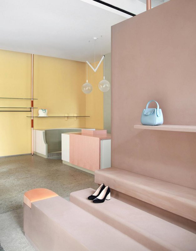 Итальянские архитекторы использовали свой фирменный подход: в интерьере присутствует микс необычных материалов с интересными цветами и продуманными деталями. Магазин площадью 180 кв. метров разделен угловым деревянным экраном-перегородкой, покрытым штукатуркой.